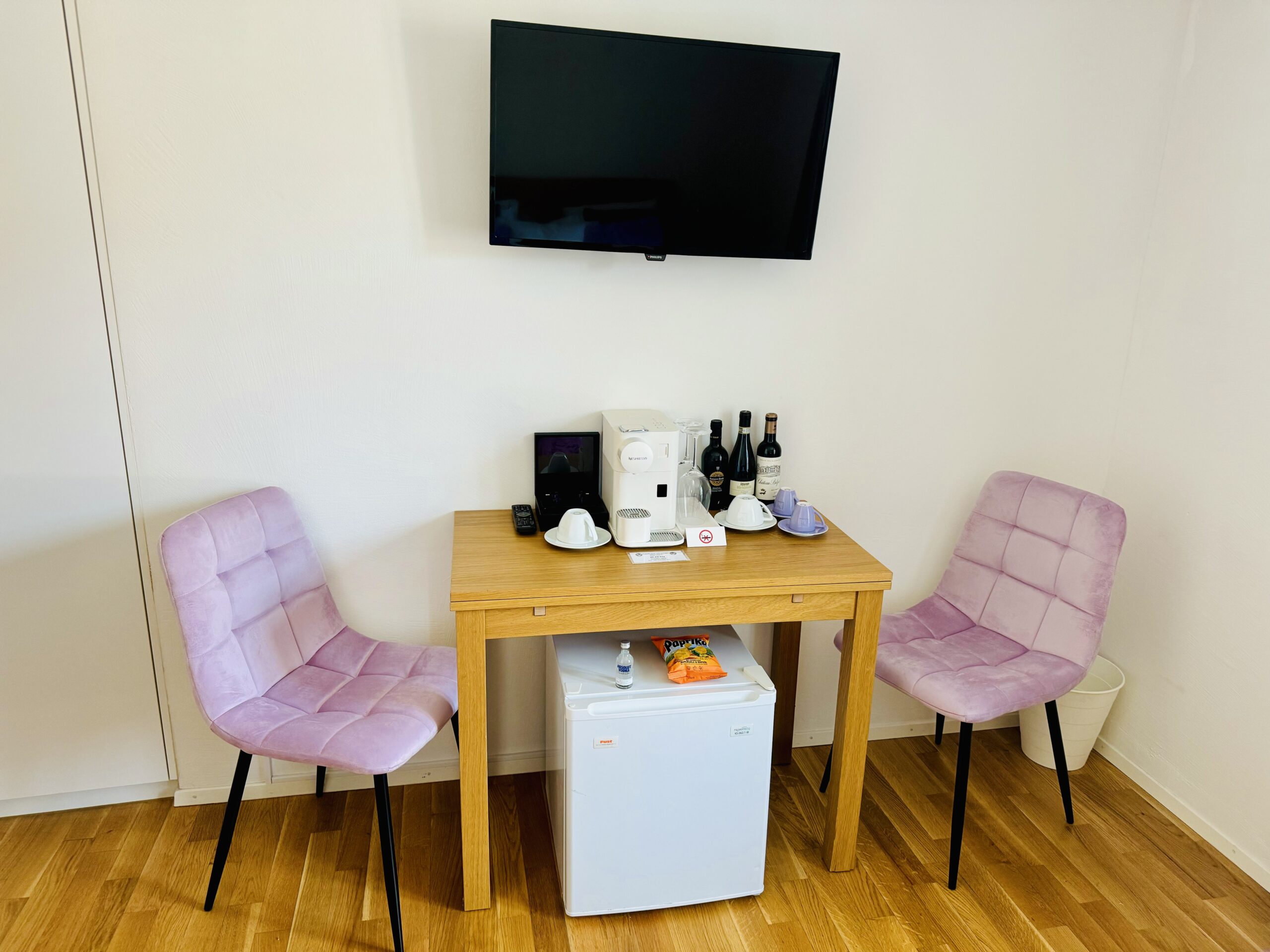 The perfect lifestyle® ★★★★ Superior Design Boutique room features a queen-size bed with full-length mattress, en suite bathroom with cotton terry towels, flat screen TV, minibar with alcoholic and non-alcoholic refreshments, snack bar with salty and sweet nibbles, a Nespresso™ coffee machine, free high-speed WiFi, free parking 50m from the hotel.