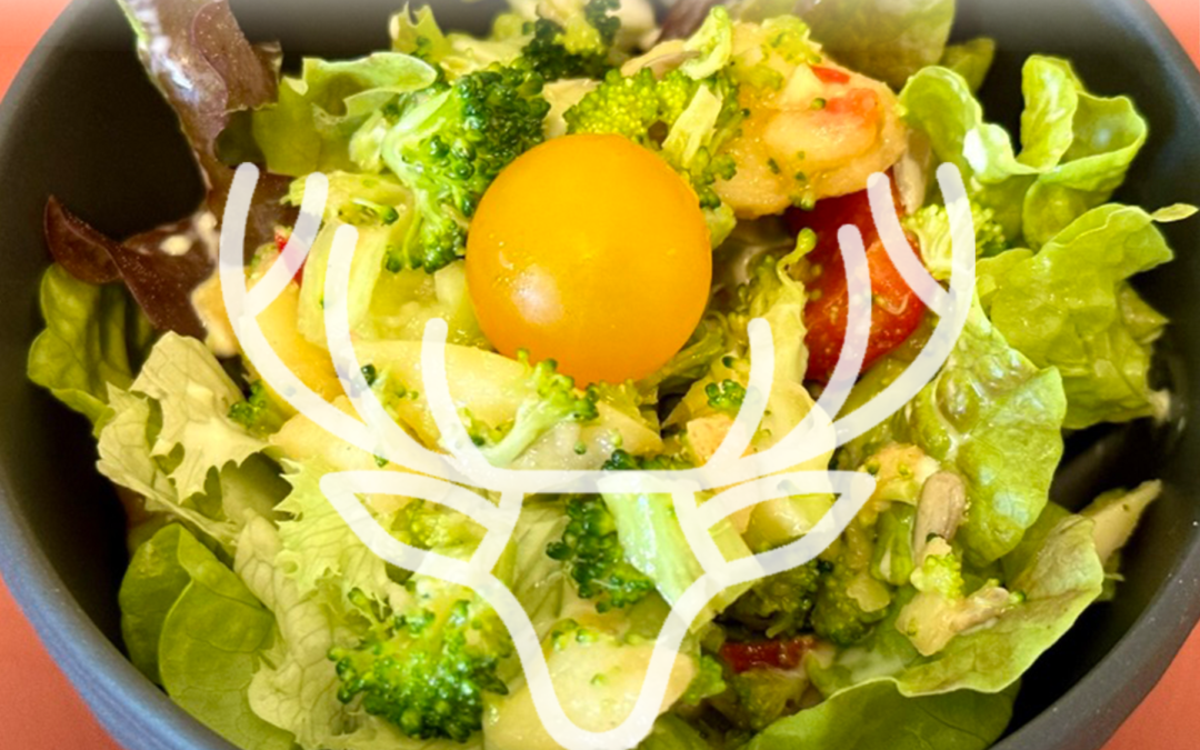 Unser Junior Vitamin Salat reichen wir aktuell mit grünem Blattsalat der Saison und runden ihn mit etwas unseres erfrischendem Hirschen Broccoli Salat mit Peperoni, Apfel und Sonnenblumen-Kernen ab.