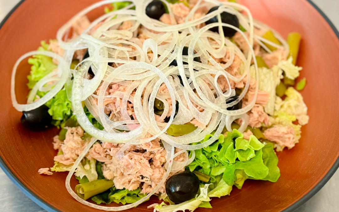Unser Salat Niçoise bringt französisches Urlaubsfeeling auf den Tisch. Frische Blattsalate und Buntes Gemüse, abgerundet mit zartem RIO MARE Thunfisch, Oliven und Zwiebelringe.