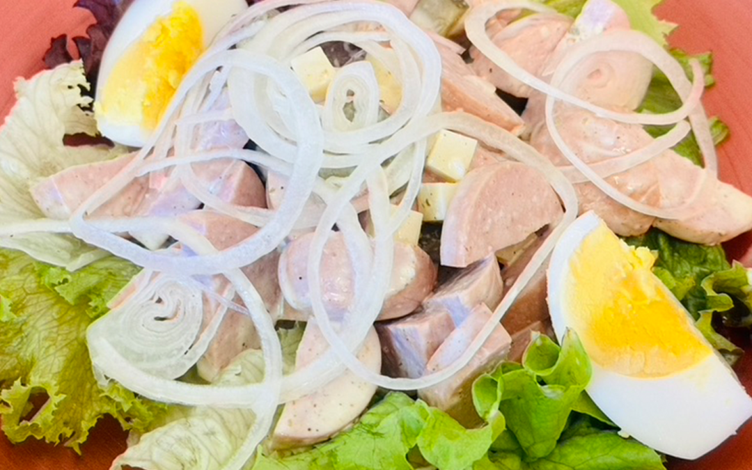 Unser hausgemachter Wurst-Käsesalat aus BIO «Servelatwurst» und rezentem Emmentaler AOP Käse an einer leckeren Sauce mit Essiggurken. Gekrönt reichen wir den Salat mit frischen Zwiebelringen und gekochtem BIO Ei. Je nach Saison kann der Salat auch weitere oder andere Gemüsearten beinhalten. Dazu passt auch perfekt unsere frische «Brezen», wahlweise mit Butter gefüllt oder nature.