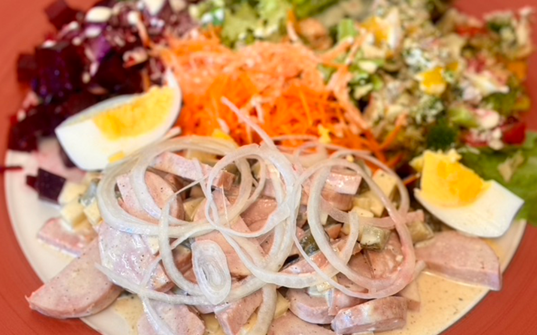 Unser hausgemachter Wurst-Käsesalat aus BIO «Servelatwurst» und rezentem Emmentaler AOP Käse an einer leckeren Sauce mit Essiggurken, gekrönt mit frischen Zwiebelringen und gekochtem BIO Ei sowie weitere Salate wie; Grüne Blattsalate, frisch geriebenen «Rübli», Randen-Salat mit Zwiebeln, erfrischendem Broccoli Salat mit Peperoni, Apfel und Sonnenblumen-Kernen, Tomaten. Je nach Saison kann der Salat auch weitere oder andere Gemüsearten beinhalten. Dazu passt auch perfekt unsere frische «Brezen», wahlweise mit Butter gefüllt oder nature.